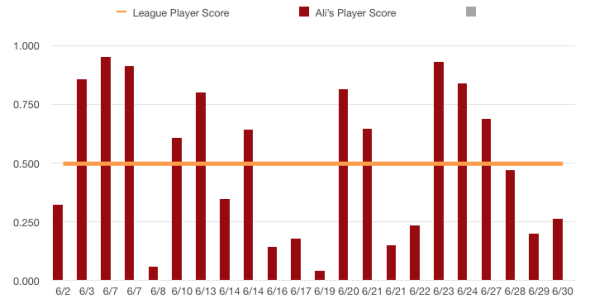 Looking at the chart above, we can see that Ali had a pretty up and down month. His finishes above average were equal to his finishes below average. However, player score isn’t what matters at the end… it’s the points.